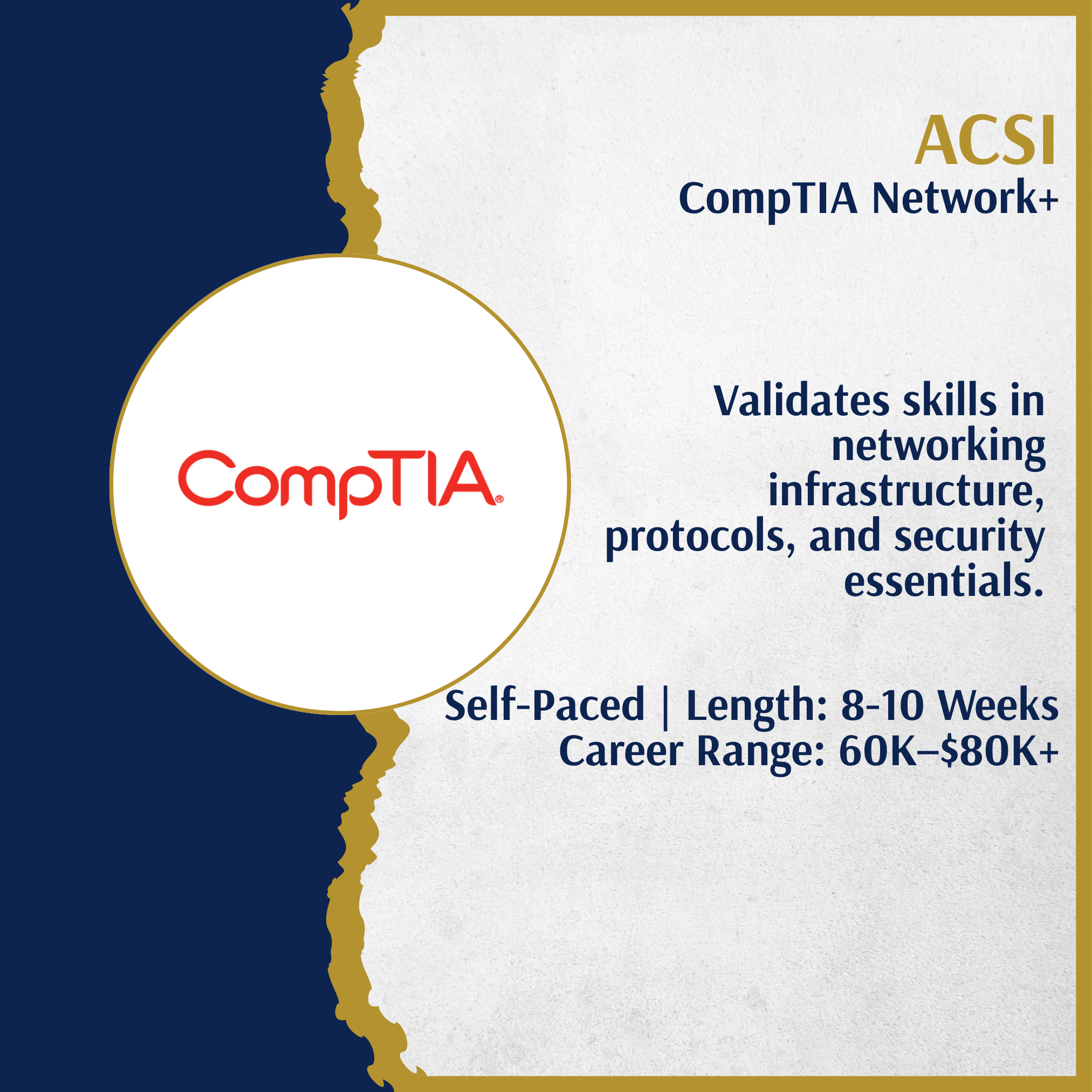 This course equips you with hands-on networking knowledge essential for modern IT roles. You’ll prepare for the Network+ exam and build real-world skills to configure, secure, and troubleshoot wired and wireless networks.